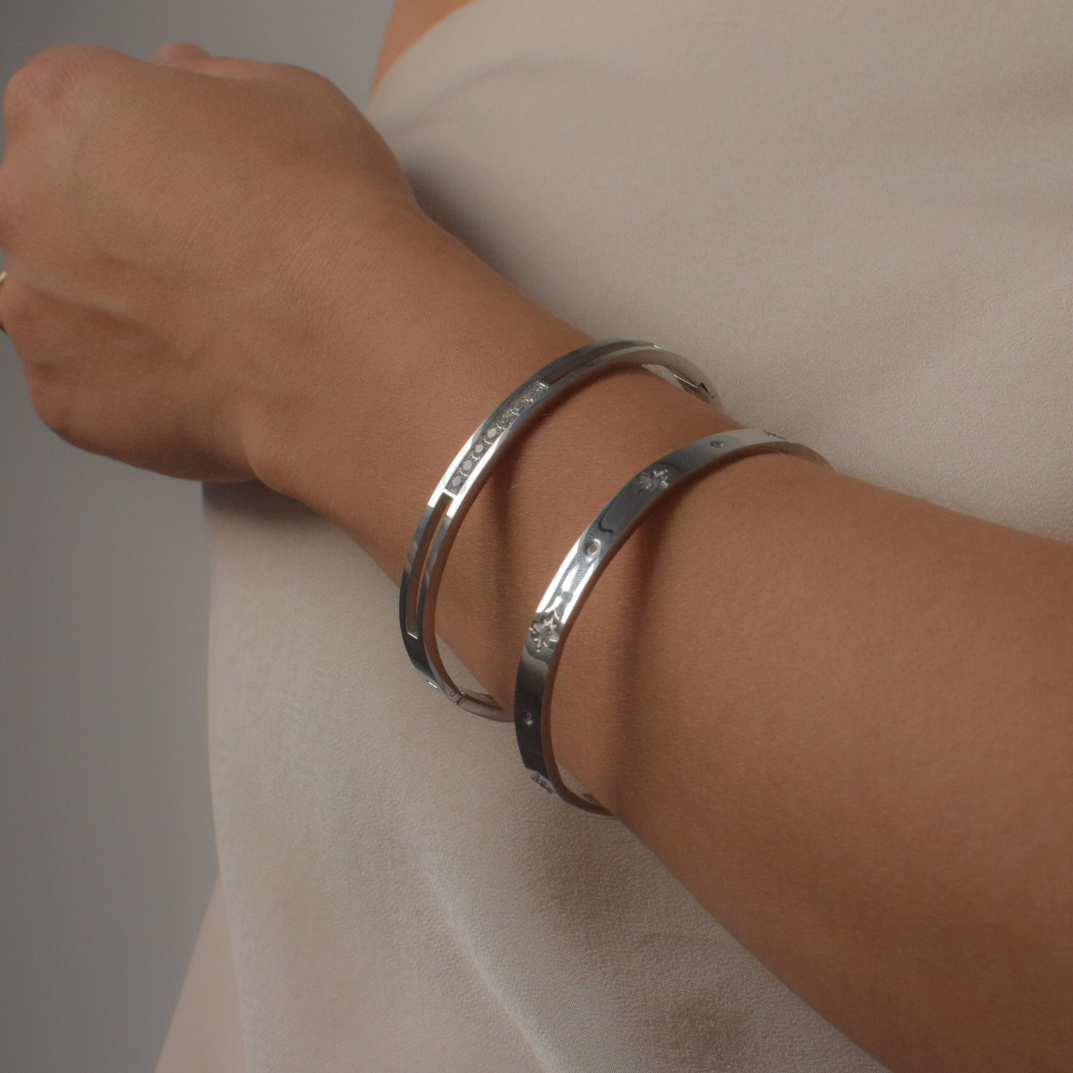 Elevate your style with our Guidance Bangle, featuring round white cubic zirconias delicately placed around the cuff.