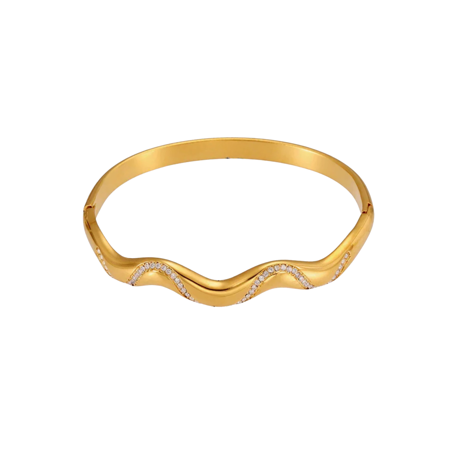 The Harmony Bangle showcases a freeform band design, accented with white cubic zirconia grain detailing in a graceful wavy pattern, adding a touch of sparkle.