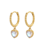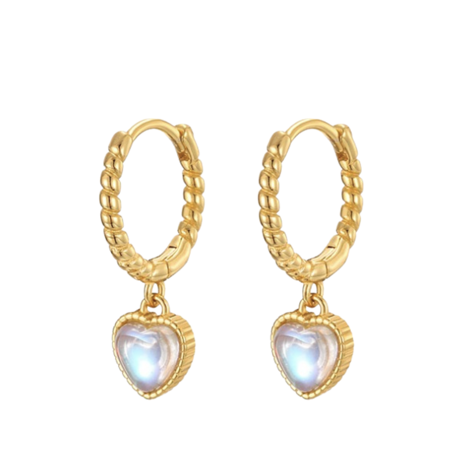 Crafted from gleaming sterling silver, these heart-shaped hoops cradle shimmering moonstones that catch the light with every turn.