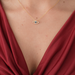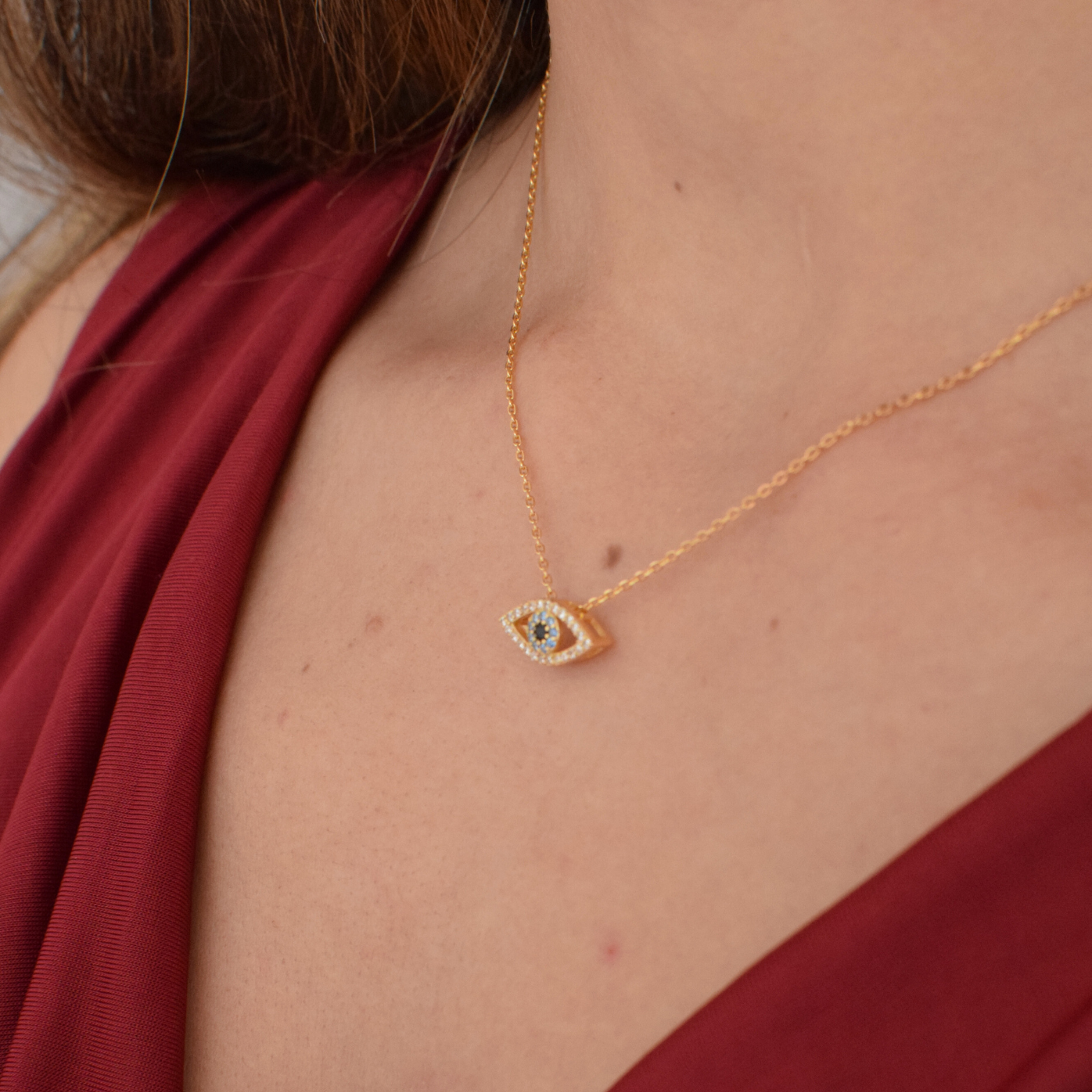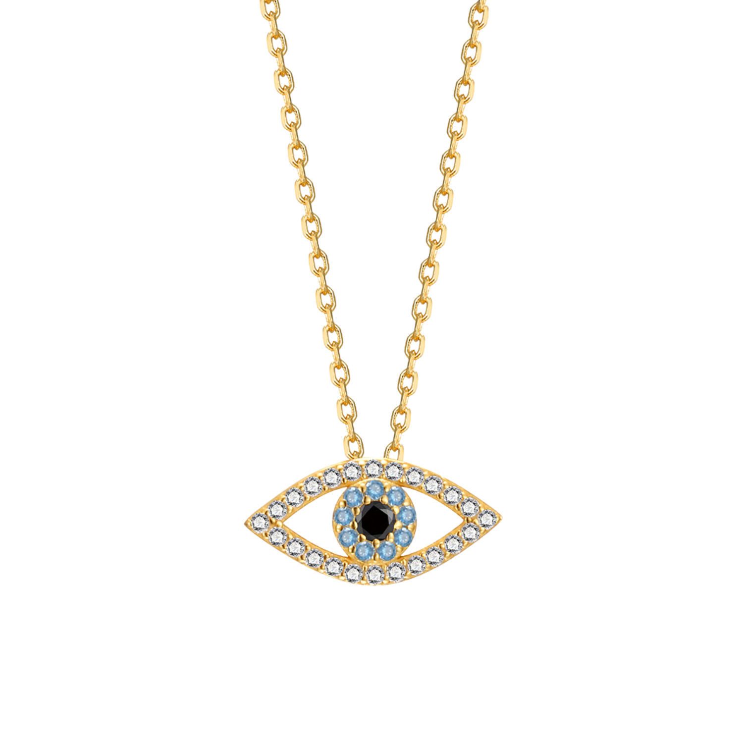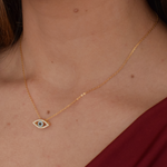 The Mira Necklace features an elegant evil eye pendant adorned with shimmering blue cubic zirconias, set in lustrous 14K gold plating.