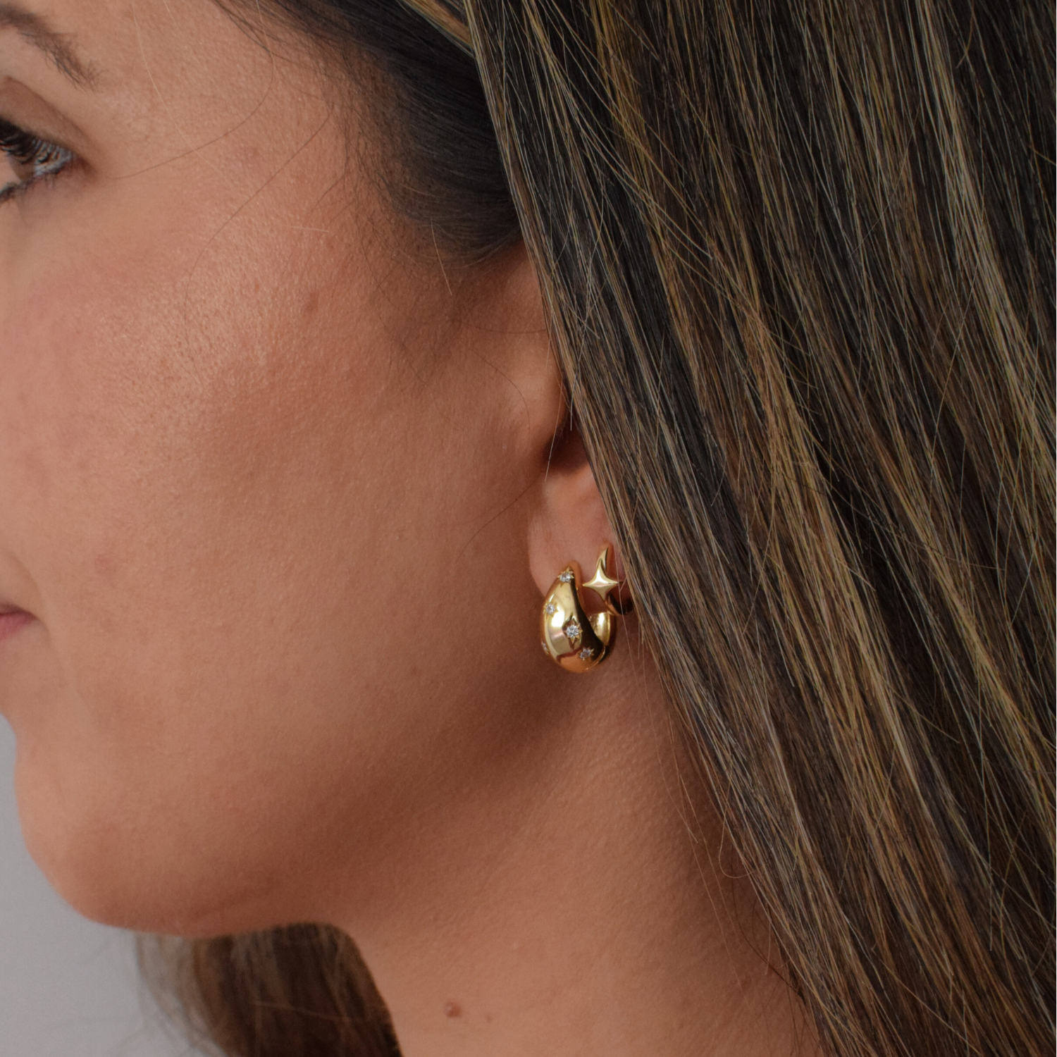 Exquisitely plated with 14K gold, these hoops, adorned with star detailing, seamlessly blend timeless elegance with a touch of modern style, making them the ultimate choice for making a luxurious statement.