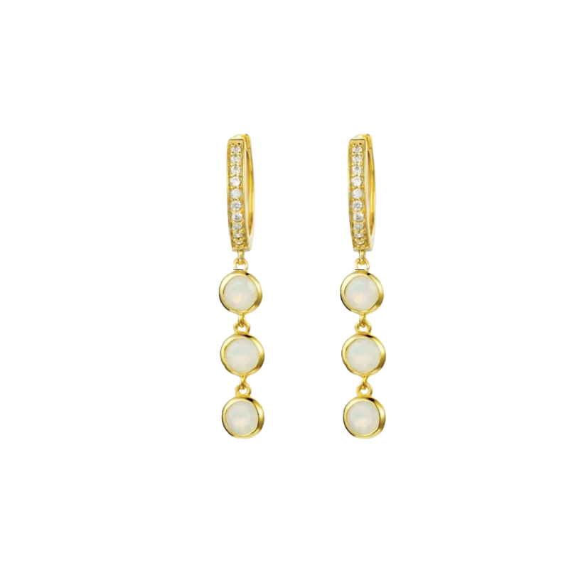 The Orbit Earrings feature bezel-set round moonstones paired with micro-claw set white cubic zirconias, creating a delicate, sparkling drop design.