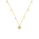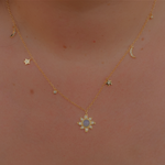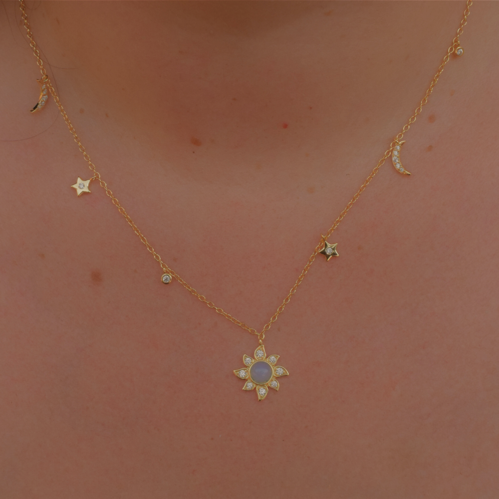 The Phase Necklace features a delicate sun, luna and star, each thoughtfully detailed with shimmering cubic zirconias and moonstone. Designed in a dainty charm-style silhouette, the free-moving elements catch the light as they move with you, symbolising the ever-changing phases we grow through.