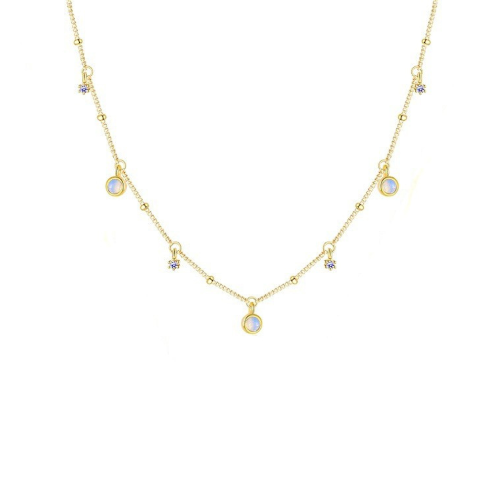 The Orbit Necklace features delicate round moonstones and violet cubic zirconias, thoughtfully set along a dainty ball chain. Each stone catches the light as it moves, creating a subtle sparkle that evokes the magic of the night sky and the gentle rhythm of the cosmos. Perfect for layering or wearing alone, it’s a piece that feels both whimsical and timeless.
