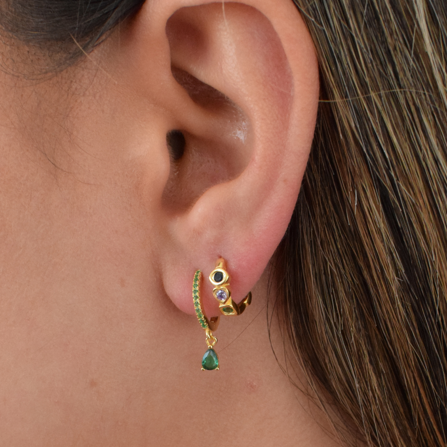 The stunning Pia hoops feature a dark green, pear cut, cubic zirconia dropping from a pave set hoop.