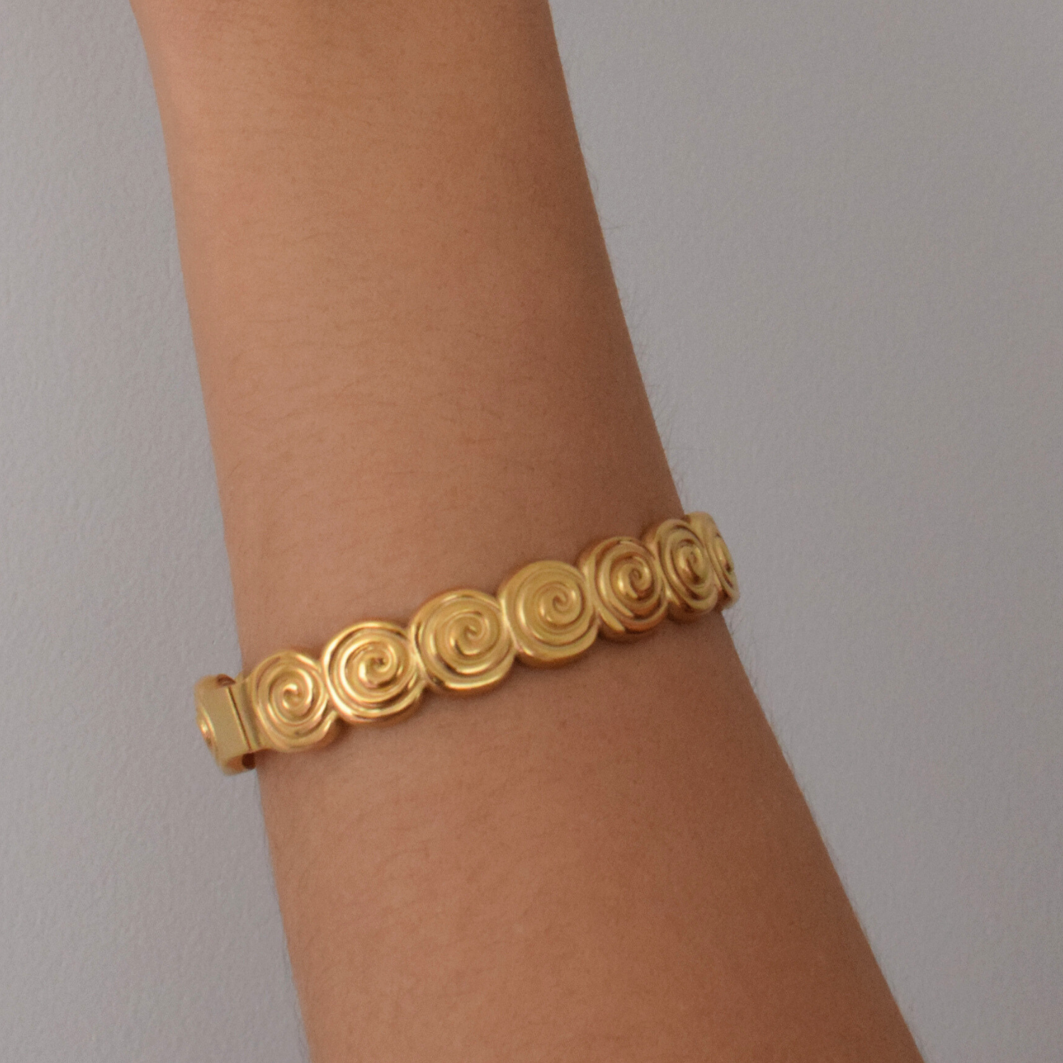 Made from 18K gold plated stainless steel, this bangle boasts a durable and unique spiral design that adds a touch of sophistication to any outfit.