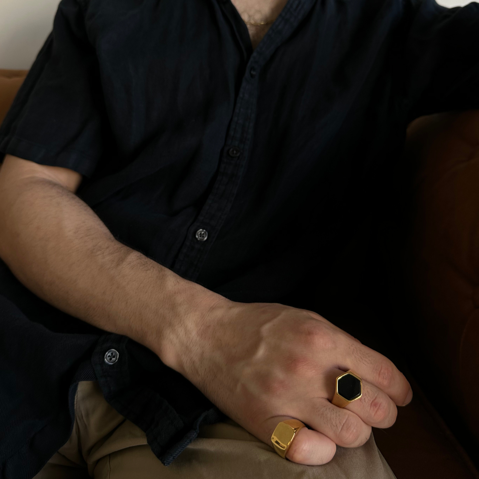 A timeless square signet ring crafted from durable stainless steel with a luxurious 18K gold plating.