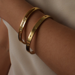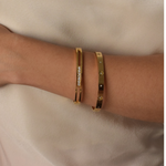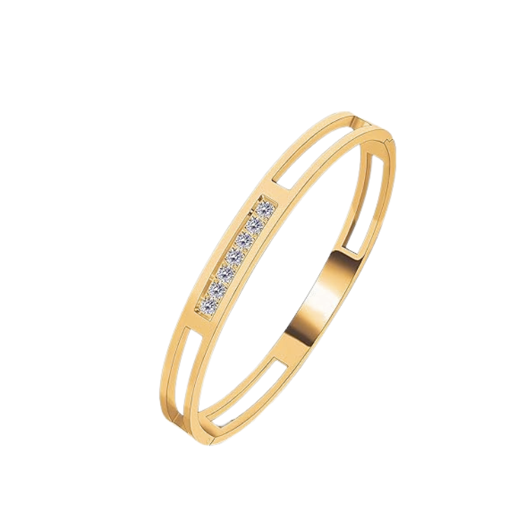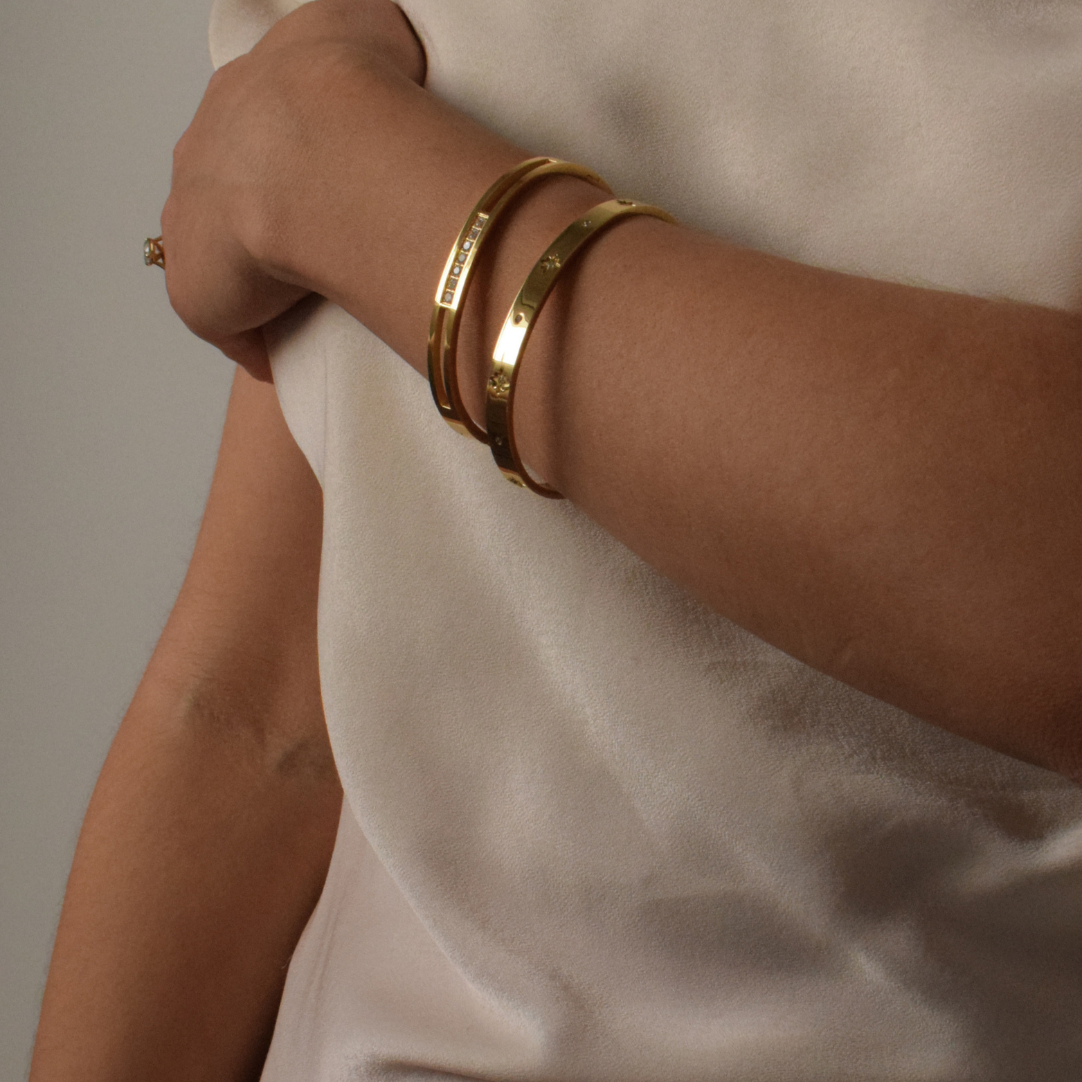 The Stella Bangle boasts a split band adorned with white round cut cubic zirconias, meticulously placed using a micro claw setting. This sophisticated piece is the perfect addition to any collection.